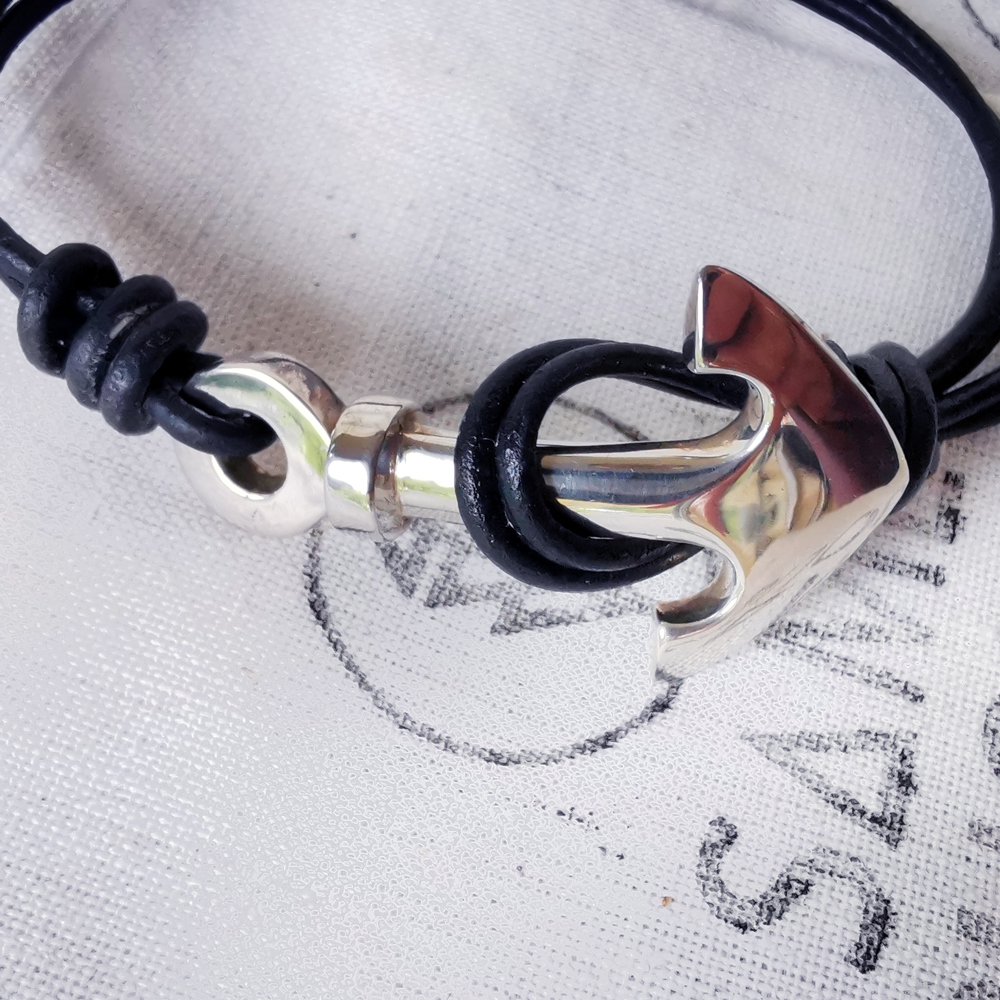 Un bijou taille unique composé d’un cordon de cuir et d’une ancre solide en argent 925/1000.